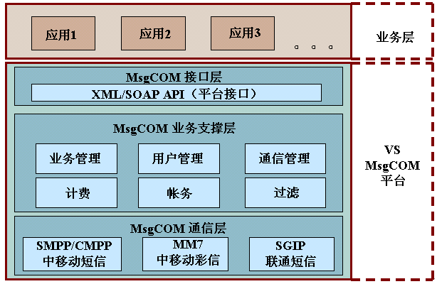 - 業(yè)務層:運行在VS MsgCOM的各類業(yè)務應用。