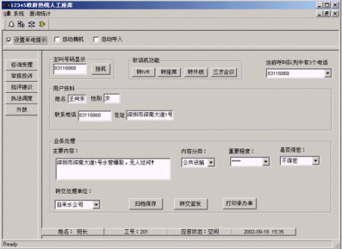 系統(tǒng)提供人工座席代表直接與居民對話,記錄舉報、投訴、批評、建議等情況,解釋政府相關(guān)政策法規(guī);可以將用戶來電直接將轉(zhuǎn)到各政府部門和和市(縣)政府領(lǐng)導(dǎo),以應(yīng)對緊急事件的發(fā)生;可通過外撥市民(人民群眾)電話,將緊急或疑難問題的處理結(jié)果主動反饋給百姓;或利用外撥功能開展民意調(diào)查,調(diào)研,幫助政府制定出最符合群眾利益的政策,更好地實(shí)踐"三個代表"重要思想和帶領(lǐng)人民群眾全面建設(shè)小康社會。