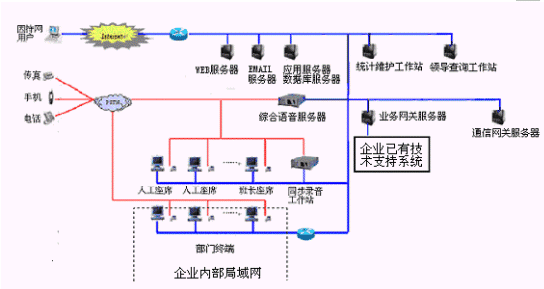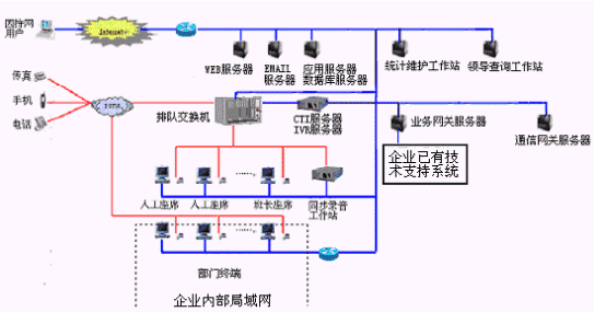 網(wǎng)上服務(wù)系統(tǒng):與INTENET結(jié)合,接受來自網(wǎng)上的呼叫請(qǐng)求,提高服務(wù)和營(yíng)銷的質(zhì)量和效率。