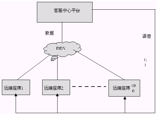 所謂PSTN+DDN的聯(lián)網(wǎng)方式是遠(yuǎn)端座席和主呼叫中心的語音和數(shù)據(jù)互連是分開來的,彼此互相不干擾。語音方面遠(yuǎn)端座席和主呼叫中心的相聯(lián)與前兩種方式不同,是主呼叫中心通過外呼將話路接到遠(yuǎn)端座席處。數(shù)據(jù)方面遠(yuǎn)端座席和主呼叫中心的相聯(lián)仍然直接通過DDN相連。