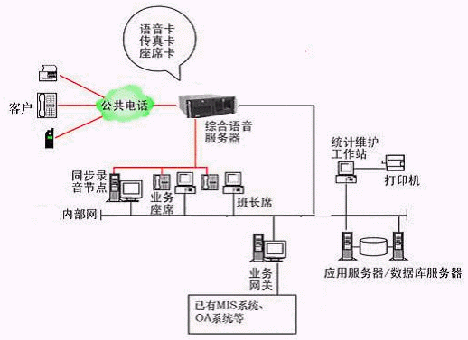 本系統(tǒng)建議采用基于計(jì)算機(jī)語音板卡的語音接入方式,支持1號(hào)線路的接入,保障系統(tǒng)的可靠性和穩(wěn)定性,可以減少煤氣公司一期工程投資,同時(shí)具有良好的系統(tǒng)性能。
