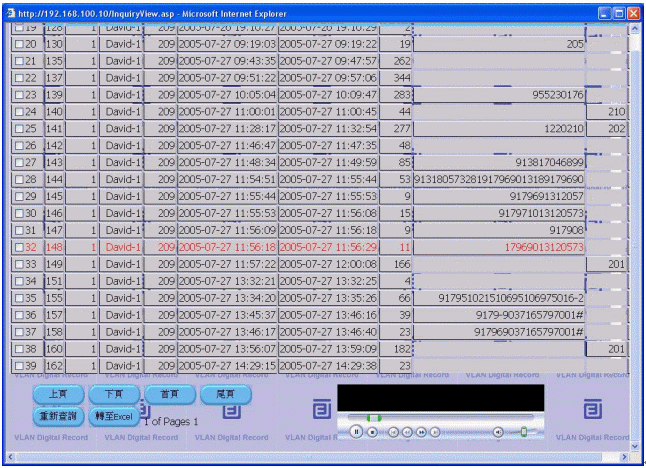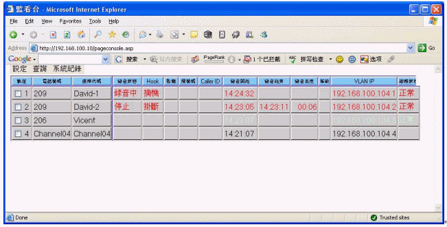 監(jiān)看臺(tái):系統(tǒng)登入后的主畫面,可以監(jiān)控各路電話的當(dāng)前使用情況(包括來電號(hào)碼、去電號(hào)碼、振鈐次數(shù)、錄音開始時(shí)間、錄音結(jié)束時(shí)間、線路狀況等信息)。并可以實(shí)現(xiàn)對(duì)任意通話的網(wǎng)絡(luò)實(shí)時(shí)監(jiān)聽。