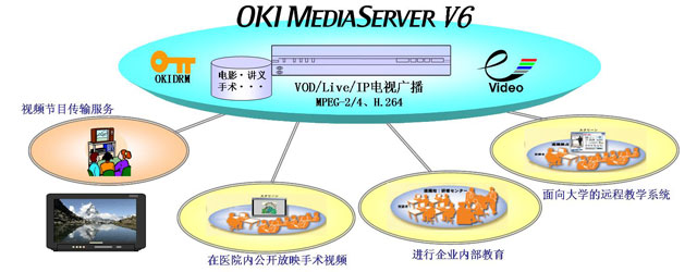 在OKI的通用視頻服務(wù)器系統(tǒng)上,將具有代表性的視頻傳輸功能作為標(biāo)準(zhǔn)服務(wù)要素,以解決方案的形式提供給用戶(hù)。以VOD(視頻點(diǎn)播)實(shí)時(shí)傳輸系統(tǒng)、中繼及監(jiān)視系統(tǒng)為代表,可以簡(jiǎn)單便捷構(gòu)筑靈活運(yùn)用視頻及語(yǔ)音的豐富多彩的系統(tǒng)。URL:http://www.oki.com/jp/BMC/。