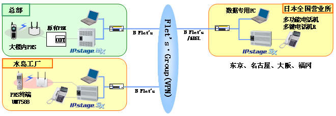 SX”通過SIP協(xié)作的IP電話系統(tǒng)。系統(tǒng)中所采用的“IPstage MX/SX”通過NTT西日本的VPN服務“Flet's・Group”相互連接,實現高音質的內線環(huán)境。使用內線電話號碼進行事業(yè)所之間的通話聯系,可以直接與想聯系的對象通話,無需傳叫電話。進而,由于工廠采用了沖電氣所制造的PHS終端“UM7588”,可以在工廠任何地方實現直接電話聯系。導入該系統(tǒng)后,即使業(yè)務場所分處幾地,也能成功實現員工間的迅速溝通。