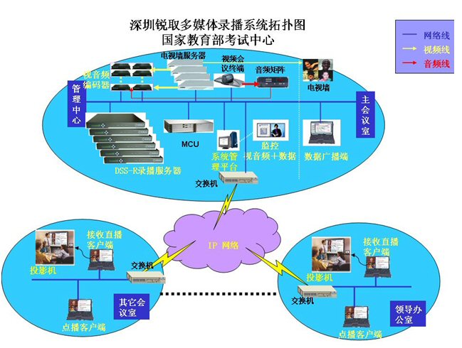 國家教育部考試中心為了對(duì)高考等大型考試實(shí)時(shí)性指導(dǎo)、監(jiān)考、培訓(xùn)等,特建立了視頻會(huì)議系統(tǒng)、監(jiān)考系統(tǒng)。為了使整個(gè)系統(tǒng)更完善、應(yīng)用價(jià)值更高,因此在此基礎(chǔ)上配置了銳取多媒體錄播系統(tǒng)。不僅實(shí)現(xiàn)了與各地考試中心及考點(diǎn)的圖像、語音和數(shù)據(jù)的交互通訊,還可以輔助系統(tǒng)完成視頻會(huì)議、監(jiān)考系統(tǒng)及培訓(xùn)的錄制、直播和點(diǎn)播功能,錄制、直播和點(diǎn)播的內(nèi)容包括了所有考試中心、考點(diǎn)圖像以及聲音和數(shù)據(jù)信號(hào)。