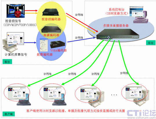 可通過單播或組播方式將會(huì)議現(xiàn)場(chǎng)的視頻、音頻、計(jì)算機(jī)動(dòng)態(tài)屏幕在網(wǎng)絡(luò)上進(jìn)行實(shí)時(shí)直播,用戶可通過IE瀏覽器登錄服務(wù)器實(shí)時(shí)接收直播的視頻、音頻和計(jì)算機(jī)動(dòng)態(tài)屏幕內(nèi)容。系統(tǒng)獨(dú)家支持組播代理功能,無須更改網(wǎng)絡(luò)設(shè)備的設(shè)置即可實(shí)現(xiàn)跨網(wǎng)段的組播。系統(tǒng)獨(dú)家支持文件組播功能,可將錄制好的文件在網(wǎng)絡(luò)上再次進(jìn)行組播。