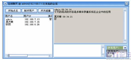 系統(tǒng)增加了多方文字互動聊天功能,在線聊天功能可以選擇給所有人員發(fā)送消息,也可以選擇給某一特定人員發(fā)送。這樣在會議或培訓(xùn)的過程中,管理員可以選擇性的提出相應(yīng)的問題給相關(guān)人員,考核相關(guān)人員的培訓(xùn)效果;其他人員也可以將會議或培訓(xùn)過程中遇到的疑問、難點及時的反應(yīng)給管理員進(jìn)行解答,增強會議的成效。