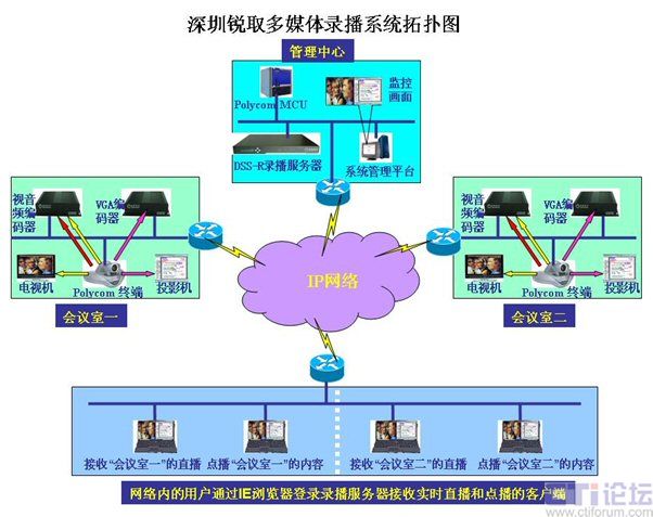 錄播服務(wù)器放置在管理中心,視音頻編碼器(采集聲音、圖像)放置在會(huì)議室,VGA編碼器(采集VGA信號(hào))放置在會(huì)議室,客戶端分別為網(wǎng)絡(luò)內(nèi)的任意一臺(tái)計(jì)算機(jī)。整個(gè)系統(tǒng)簡(jiǎn)單明了,分布靈活,無(wú)需專業(yè)布線即可完成安裝。各部分功能如下: