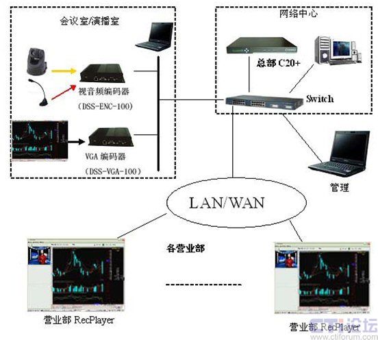 在分析了華安證券的實(shí)際需求和網(wǎng)絡(luò)環(huán)境以后,決定采用一套DSS-R-C20+來(lái)組建整個(gè)流媒體系統(tǒng)。系統(tǒng)由媒體采集系統(tǒng)視音頻編碼器(DSS-ENC-100)/VGA編碼器(DSS-ENC-100),流媒體處理和錄制系統(tǒng)(C20+)和客戶端RecPlayer組成。通過此系統(tǒng)可以實(shí)現(xiàn)語(yǔ)音、視頻和計(jì)算機(jī)桌面的同步實(shí)時(shí)直播、錄制和點(diǎn)播。系統(tǒng)的結(jié)構(gòu)圖如下: