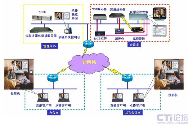 如圖所示:多媒體錄播服務(wù)器放置在管理中心,高清編碼器(采集高清視頻及聲音)及VGA編碼器(采集雙流信號(hào))放置在會(huì)議室,客戶(hù)端可以是網(wǎng)絡(luò)內(nèi)的任意一臺(tái)計(jì)算機(jī)。整個(gè)系統(tǒng)簡(jiǎn)單明了,分布靈活,部署簡(jiǎn)單,系統(tǒng)只要連接了信號(hào)線(xiàn),配置了IP地址即可投入使用,無(wú)須專(zhuān)業(yè)布線(xiàn)。各部分配置如下:
