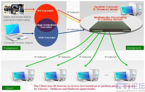Encoder可用于采集高清視頻的信號或者VGA的信號。前臺(tái)的編碼器編碼好通過IP網(wǎng)絡(luò)傳送到服務(wù)器Multimedia