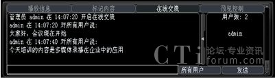 系統(tǒng)增加了多方文字互動(dòng)交流功能,在線(xiàn)交流功能可以選擇給所有人員發(fā)送消息,也可以選擇給某一特定人員發(fā)送。這樣在會(huì)議或培訓(xùn)的過(guò)程中,管理員可以選擇性的提出相應(yīng)的問(wèn)題給相關(guān)人員,考核相關(guān)人員的培訓(xùn)效果;其他人員也可以將會(huì)議或培訓(xùn)過(guò)程中遇到的疑問(wèn)、難點(diǎn)及時(shí)的反應(yīng)給管理員進(jìn)行解答,增強(qiáng)會(huì)議或培訓(xùn)的成效。
