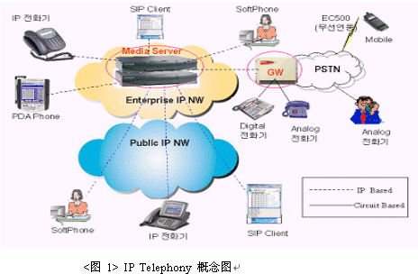 IP Telephony是在 VoIP技術(shù) (Voice over IP, 單純壓縮語音傳送技術(shù)) 上的擴展, 將企業(yè)內(nèi)部交換機上實現(xiàn)的各種電話功能與基于IP技術(shù)的通訊應(yīng)用相結(jié)合,提高用戶的業(yè)務(wù)效率。同時不僅支持現(xiàn)有的設(shè)備,包括PBX, 電話機等還支持基于SIP(Session Initiation Protocol)的終端,提高了電話網(wǎng)的安全性,擴展了通訊功能,是一種能兼容所有支持IP技術(shù)終端的通訊平臺。[圖 1]