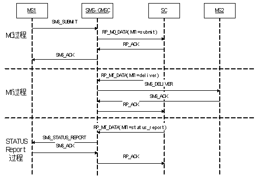 上圖是表示出了一個移動臺MS1向另一移動臺MS2發(fā)送短消息的典型過程,圖中忽略了MSC、HLR、BS等功能實體,重點說明的是MO、MT、StatusReport三個典型過程中,SMS-GMS與SC之間的消息序列。