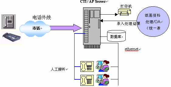 系統(tǒng)以計(jì)算機(jī)系統(tǒng)(CTI/AP Server)為核心,配備多功能呼叫中心卡及系統(tǒng)軟件。投訴人電話撥入時(shí),由計(jì)算機(jī)提示語音指導(dǎo)操作過程,例如選擇留言、人工投訴或者傳真。如已經(jīng)有一套辦公自動(dòng)化系統(tǒng)(OA),本系統(tǒng)可以和它連接(接口定制)使得投訴內(nèi)容自動(dòng)進(jìn)入OA流程;如果沒有OA系統(tǒng),則可以選擇將投訴內(nèi)容在打印機(jī)打印(表單)后進(jìn)入人工投訴處理流程,再由人工將處理的結(jié)果人工輸入CTI/AP Server以供查詢;如果需要訪問其它網(wǎng)絡(luò)資源,本系統(tǒng)提供電子郵件及URL的網(wǎng)絡(luò)資源訪問手段,使您輕松訪問網(wǎng)絡(luò)資源。