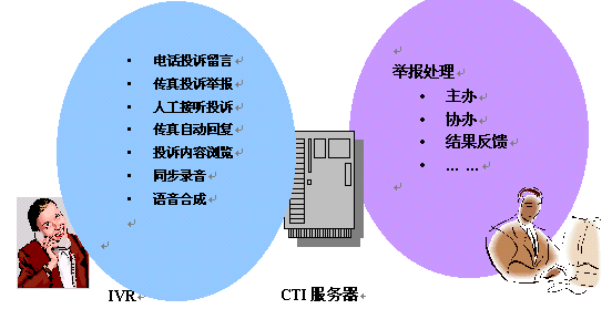 以CTI(計(jì)算機(jī)和電話集成)技術(shù)為系統(tǒng)核心,使投訴舉報(bào)人可以采用多種方式將信息轉(zhuǎn)達(dá)到相關(guān)部門設(shè)立的電話投訴舉報(bào)中心,待舉報(bào)處理完畢后收集處理結(jié)果并登記入數(shù)據(jù)庫,傳遞供各級(jí)領(lǐng)導(dǎo)處理。