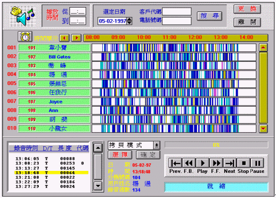 以時(shí)間為水平軸、分機(jī)號碼為垂直軸機(jī)制,錄音分布狀況一目了然。該窗口下,可經(jīng)由日期、分機(jī)之選擇、或客戶代號之輸入,輕松找到您要聽取錄音檔。您只要點(diǎn)取錄音棒的定點(diǎn),即得知錄音記錄清單,播放操作: