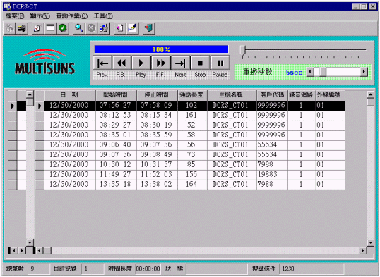 在錄音設(shè)備與用戶之程控交換機(jī)(PBX)整合條件下,DCRS CT Integra允許用戶以中繼線號碼、分機(jī)號碼、開始通話時(shí)間、通話長度、撥入電話、撥出電話、服務(wù)人員代碼、服務(wù)人員姓名、服務(wù)人員部門別、撥入群組代碼 (ACD Group ID)、撥號字符串、來話號碼(Caller ID)等等為收尋錄音資料條件。再依您需要找尋條件,重建單位內(nèi)部人員與外部人員雙方通話內(nèi)容就輕而易舉。舉例說,您可以在一瞬間就查詢到您所聘雇之客服員張小姐于過去一星期中接到某某公司李先生多少通電話,李先生是什幺時(shí)候打來的,張小姐每一通電話花多少時(shí)間去服務(wù)李先生,其講話的內(nèi)容又是什幺。