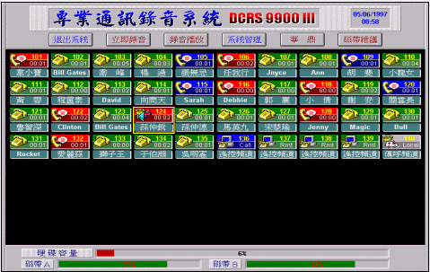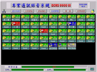 DCRS與BRS系列之全數(shù)字專業(yè)通訊簿音系統(tǒng),彩色動畫窗口,配合鼠標(biāo)操作,使您一目了然,操作容易。您可由主窗口圖標(biāo)中,清楚知道每一回路目前錄音狀態(tài),例如呈綠色的圖標(biāo)是顯示回路是閑置狀態(tài)(沒有通話狀態(tài)),用不同顏色加上不同圖案,是最易懂、最一目了然表現(xiàn)方式。各種操作按鍵與儲存裝置(Storage Media)狀態(tài)也出現(xiàn)在很醒目位置上也是另一系統(tǒng)特色。下面文章對回路各種常見圖標(biāo)有進(jìn)一步說明。