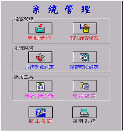三個(gè)方塊區(qū):檔案管理區(qū)、系統(tǒng)架構(gòu)區(qū)和應(yīng)用工具區(qū)。各方塊區(qū)內(nèi)有其包含之功能指令。此外,"回主畫面"的功能鍵提供您可回到主窗口畫面的功能;"關(guān)閉系統(tǒng)"功能鍵則提供您正常操作關(guān)掉此錄音系統(tǒng)的功能。您不須依賴操作手冊,也不需要別人指導(dǎo),您就可以執(zhí)行一些系統(tǒng)維護(hù)設(shè)定功能。