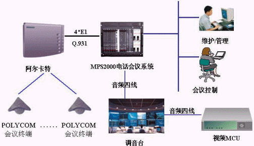 國電中心的音頻電話會議系統(tǒng)采用MPS2000電話會議系統(tǒng)。MPS2000電話會議系統(tǒng)通過4個E1與阿爾卡特的4400交換機相連,采用Pri信令,用戶通過POLYCOM的會議終端機參加會議;MPS2000電話會議系統(tǒng)通過音頻四線與調(diào)音臺相連,并通過調(diào)音臺與視頻MCU相連,同時MPS2000電話會議系統(tǒng)通過以太網(wǎng)與其內(nèi)部的局域網(wǎng)相連,同時在局域網(wǎng)內(nèi)設(shè)置一臺維護終端用于對系統(tǒng)的維護管理,會議控制臺通過WEB方式對會議進行控制。