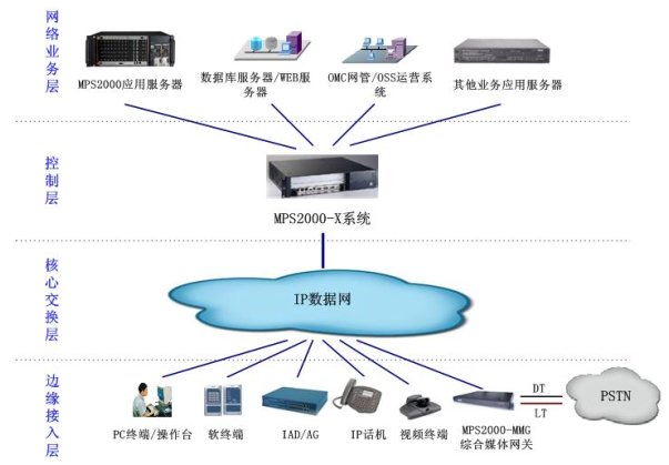 控制層:由MPS2000-X作為軟交換應(yīng)用,完成呼叫控制、媒體網(wǎng)關(guān)接入控制、資源分配、協(xié)議處理、路由、用戶認(rèn)證、計費等功能,并可向用戶提供基本語音業(yè)務(wù)、增值語音業(yè)務(wù)、話務(wù)臺業(yè)務(wù)等。