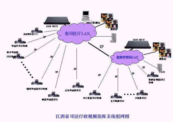 江西司法視頻會議系統(tǒng)的拓撲結(jié)構(gòu)如圖所示。整個視頻會議系統(tǒng)為星型拓撲結(jié)構(gòu),其中二級網(wǎng)以省司法廳和省監(jiān)獄管理局為主會場,放置2個MCU;另外,包括11個地市司法局的分會場(南昌、九江、贛州、吉安、撫州、鷹潭、萍鄉(xiāng)、新余、上饒、景德鎮(zhèn)、宜春),14個監(jiān)獄和農(nóng)場分會場,傳輸網(wǎng)絡(luò)為2M IP網(wǎng)絡(luò),視頻會議協(xié)議為H.323;司法局和監(jiān)獄管理局也可以單獨成網(wǎng),在分別依托省司法廳和省監(jiān)獄管理局MCU的情況下,各地市司法局或監(jiān)獄系統(tǒng)可與省司法廳或省監(jiān)獄管理局單獨進行雙向的視頻會議,整個系統(tǒng)具有很強的靈活性和擴展性。
