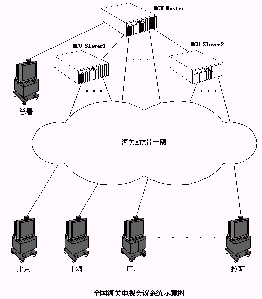 與海關(guān)ATM網(wǎng)一樣,海關(guān)電視會議系統(tǒng)也是以總署為中心的星形結(jié)構(gòu)?偸鹋渲糜腥齻相互級連的MCU,其中一個為Master,另外兩個為Slaver,分署和各海關(guān)的會議終端設(shè)備通過ATM網(wǎng)的PVC信道分別連接到Master或Slaver