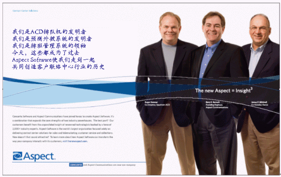 我們可以看到全新的Aspect Software將會給我們的客戶、合作伙伴以及我們的員工帶來更大的利益,我們擁有廣泛的解決方案、強大的研發(fā)團隊以及支持隊伍,Aspect將會緊密地與您合作,在發(fā)展和實施呼叫中心解決方案的同時持續(xù)給您的業(yè)務帶來新的價值。