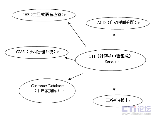 以CTI(計算機電話集成)為核心模塊,實現(xiàn)對IVR(交互式語音應(yīng)答)、ACD(自動呼叫分配)、CMS(呼叫管理系統(tǒng))、板卡+工控機、Customer Database(用戶數(shù)據(jù)庫)的統(tǒng)一管理。呼叫管理系統(tǒng)功能實現(xiàn)——