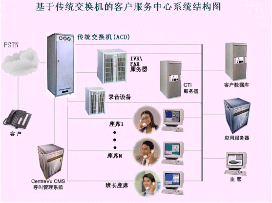 但是由于傳統(tǒng)交換機(jī)在語音資源、傳真資源等呼叫中心基本信息資源處理能力方面的匱乏,必須通過語音板卡和PC機(jī)的方式解決,有時因為系統(tǒng)容量大,甚至需要多臺共同服務(wù),其IVR(交互式語音應(yīng)答)和FAX、CTI服務(wù)器卻只能達(dá)到PC機(jī)標(biāo)準(zhǔn)。所以開發(fā)出的系統(tǒng)雖然前置交換為電信級的標(biāo)標(biāo)準(zhǔn),但是其整體性能、穩(wěn)定性仍受PC插卡方式的影響。另外,由于交換機(jī)和IVR、FAX、CTI等之間的相互連接會受其密合程度和其他外來因素影響,會造成一些不可預(yù)知的系統(tǒng)故障。不僅交換機(jī)+CTI服務(wù)器+IVR服務(wù)器(語音板卡+PC機(jī))+傳真服務(wù)器(傳真卡+PC機(jī))+錄音模塊設(shè)備(監(jiān)控錄音卡+PC機(jī))的建設(shè)成本非常高,并且編程開發(fā)較復(fù)雜。