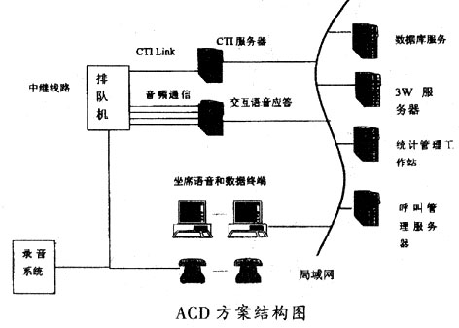 這種方案的核心思想是在專用交換機(jī)+ACD的基礎(chǔ)上擴(kuò)展路由和統(tǒng)計(jì)的功能,開(kāi)放CTI -Link接口,用CTI技術(shù)實(shí)現(xiàn)通信和計(jì)算機(jī)的功能結(jié)合,再配以必要的語(yǔ)音和數(shù)據(jù)庫(kù)系統(tǒng),從而以強(qiáng)大的通信和計(jì)算機(jī)功能滿足呼叫中心的要求。