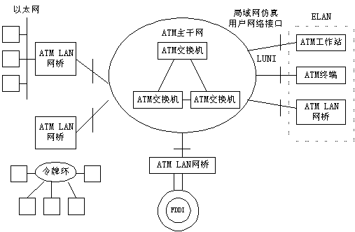 ATM 局域網(wǎng)是指以ATM結(jié)構(gòu)為基本框架的局域網(wǎng)絡(luò),它以ATM局域網(wǎng)交換機(jī)為交換點(diǎn),通過各種ATM接入設(shè)備,如ATM集線器、ATM網(wǎng)卡等將用戶接入局域網(wǎng)。ATM網(wǎng)絡(luò)具有帶寬大,速度高的優(yōu)點(diǎn),并能提供業(yè)務(wù)質(zhì)量QOS服務(wù),其性能大大優(yōu)于傳統(tǒng)共享式局域網(wǎng),但同時也面臨著高速以太網(wǎng)的挑戰(zhàn)。