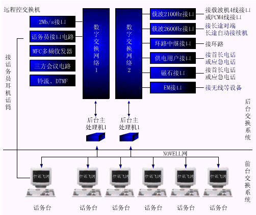"前臺(tái)座席系統(tǒng)"包括班長臺(tái)和話務(wù)臺(tái),均采用微機(jī),運(yùn)用先進(jìn)的計(jì)算機(jī)聯(lián)網(wǎng)技術(shù),將它們通過網(wǎng)絡(luò)與"后臺(tái)交換系統(tǒng)"相連。班長臺(tái)和所有話務(wù)臺(tái)的硬件連接完全相同,任何一臺(tái)損壞,不影響其它話務(wù)臺(tái)的使用,即不存在關(guān)鍵接點(diǎn),提高了系統(tǒng)的安全可靠性。全漢化圖形界面,交互式人機(jī)操作方式,簡單明了,易于掌握。所有話務(wù)臺(tái)均為集記錄、查號(hào)、市話轉(zhuǎn)接、長話轉(zhuǎn)接為一體的綜合型人工話務(wù)臺(tái),所有功能由數(shù)據(jù)定義,可分可合,可方便的進(jìn)行設(shè)置,也可臨時(shí)并席,為系統(tǒng)高質(zhì)量的服務(wù)提供了可靠的基礎(chǔ)。所有話票均在計(jì)算機(jī)上填寫,由網(wǎng)絡(luò)自動(dòng)傳送,不再使用紙?jiān)捚保膊恍枞斯し职l(fā)話票,極大的減輕了勞動(dòng)強(qiáng)度,提高了辦事效率。為了減小系統(tǒng)規(guī)模,我們將查詢、計(jì)費(fèi)、統(tǒng)計(jì)、管理、維護(hù)五種功能融合為一體,統(tǒng)一成為多功能的班長臺(tái),其功能亦可分可合,視用戶需求而定。