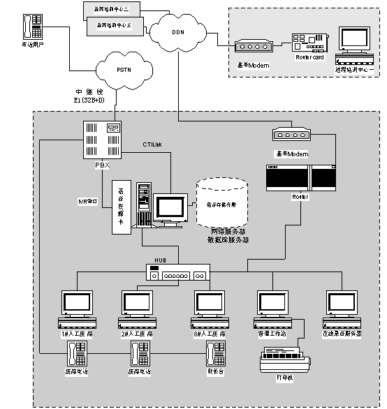 北京強訊恒通網(wǎng)絡技術公司通過利用該學院現(xiàn)有的計算機局域網(wǎng),根據(jù)該學院業(yè)務需求專門為800服務熱線設立了一組服務座席,每個座席都有座席電腦。所有撥打800熱線的電話通過CTI服務器的ACD系統(tǒng)分配到服務組最適合的座席。如該服務組暫時沒有空閑座席,則語音提示用戶等待并播放音樂,一旦有座席空閑則自動將該用戶電話轉接到空閑座席。當有外線進來接通到某個座席時,系統(tǒng)自動彈出該電話用戶的客戶資料。