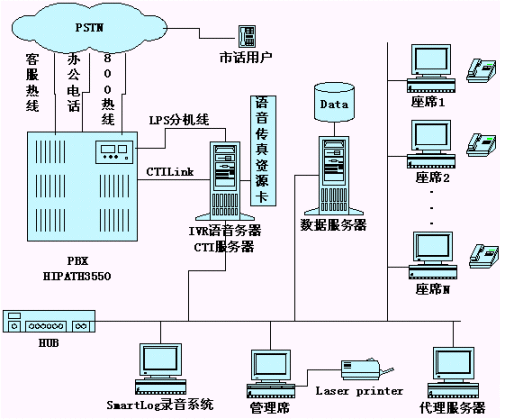 系統(tǒng)是由一臺(tái)Siemens HiPath交換機(jī),一臺(tái)CTI,IVR語(yǔ)音服務(wù)器,一臺(tái)SmartLog錄音監(jiān)聽(tīng)服務(wù)器構(gòu)成。系統(tǒng)的連接方式如上圖。系統(tǒng)目前共設(shè)置了12個(gè)人工座席,根據(jù)業(yè)務(wù)的不同分為寶健之友及代理商座席和專(zhuān)賣(mài)門(mén)市座席,每個(gè)人工座席有電腦一臺(tái),人工座席的電腦與CTI,IVR語(yǔ)音服務(wù)器及數(shù)據(jù)庫(kù)服務(wù)器共處一個(gè)局域網(wǎng)內(nèi)。