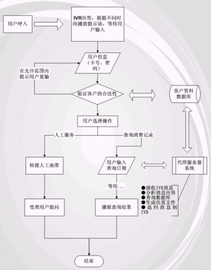 用戶通過(guò)客戶服務(wù)熱線呼入呼叫中心系統(tǒng),由通信網(wǎng)關(guān)接入IVR系統(tǒng),進(jìn)入IVR流程,用戶輸入基本信息,如卡號(hào)、密碼等,IVR系統(tǒng)將查詢(xún)客戶資料,驗(yàn)證其合法性,如果是合法會(huì)員,IVR系統(tǒng)會(huì)以語(yǔ)音合成的方式播報(bào)客戶姓名,人性化的設(shè)計(jì)盡在其中。用戶可以進(jìn)一步選擇人工服務(wù)或語(yǔ)音查詢(xún),人工服務(wù)將由UltraCTI呼叫中心服務(wù)器根據(jù)座席的工作狀態(tài)自動(dòng)將呼叫分配到某一座席,同時(shí)將用戶的信息通過(guò)TCP/IP網(wǎng)絡(luò)協(xié)議一并發(fā)送,服務(wù)人員接受呼叫,同時(shí)自動(dòng)根據(jù)用戶信息在座席的客戶端彈出受理信息界面?蛻襞c服務(wù)人員在交流的過(guò)程中,可以查詢(xún)產(chǎn)品信息庫(kù)等,當(dāng)咨詢(xún)完畢時(shí),呼叫結(jié)束,座席空閑,等待下一次呼叫。