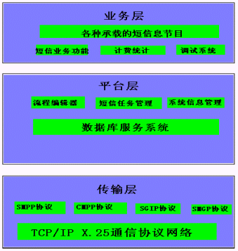 3、 傳輸層:主要完成與聯(lián)通、移動和網(wǎng)通等公司的網(wǎng)絡傳輸,本系統(tǒng)支持多種傳輸協(xié)議,SMPP協(xié)議,CMPP協(xié)議、SGIP協(xié)議和SMGP協(xié)議。