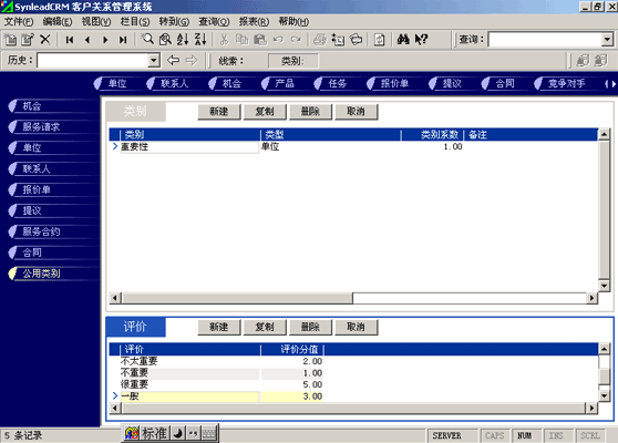 客戶單位的分類較聯(lián)系人的分類更復(fù)雜。常用的分類有:按照企業(yè)規(guī)模來分類(大、中、小,層次自定義,下同)、按照該客戶與本單位的緊密程度分類(緊密、普通、疏遠)、按照該客戶的重要性分類(重要、普通、次要)、按照該客戶的忠誠度分類(忠誠、普通、游移)。有一些用戶企業(yè),希望對客戶單位特征進行采集,進而進行客戶信用評價。信用特征的類別可以多達數(shù)十種類(詳細情況可參考有關(guān)書籍)。利用SynleadCRM,您可以為每個類指定系數(shù),為類下屬的每個評價指定評分分值。例如,您可以建立一個類別為"客戶倉庫積壓商品的情況",系數(shù)為1,該類別下屬的評價有"很多1分"、"一般3分"、"少1分"、"未知0分",如果指定某客戶該類別的評價為一般,則該項目得分為3分*1(系數(shù))=3分。依此類推,您還可以指定更多的分類與評價,例如:客戶經(jīng)營場所所處的位置、客戶在企業(yè)生命周期中所處的位置、客戶在行業(yè)中的地位、客戶產(chǎn)品的組合情況、客戶產(chǎn)品覆蓋的市場范圍、客戶產(chǎn)品的淡旺季規(guī)律、客戶近年營業(yè)額的增減趨勢、客戶的年度營業(yè)額、客戶的現(xiàn)金周轉(zhuǎn)能力、客戶的負債情況、客戶是否涉及中大訴訟等。每一個類別項目的評分經(jīng)過系數(shù)的加權(quán)運算后,可以求和,得到這個客戶的總評分。未來也可以利用分析模型對此類數(shù)據(jù)進行進一步的分析,提供輔助決策所需要的圖表和報表。