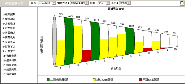 如果缺乏可預(yù)見的銷售進(jìn)程管理,企業(yè)的銷售目標(biāo)將難以順利實(shí)現(xiàn);手工的、基于結(jié)案的銷售收入統(tǒng)計造成的滯后性,降低了企業(yè)靈活應(yīng)對復(fù)雜多變市場的能力。幸好,CRM軟件提供了一套經(jīng)典的銷售進(jìn)程可視化管理工具,它包括銷售管道圖和銷售預(yù)測圖等。