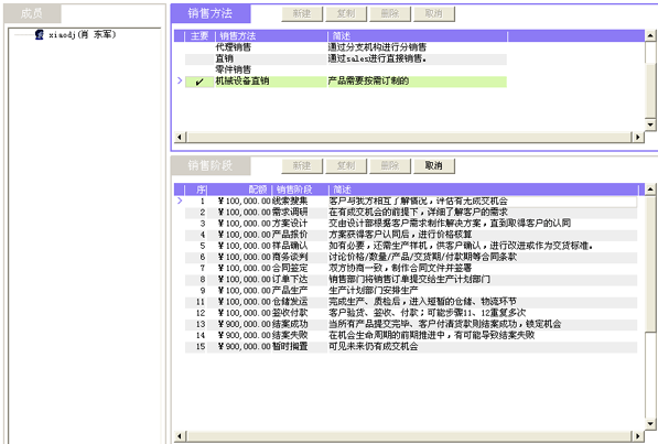 一套好的CRM軟件,應(yīng)當(dāng)同時支持多種銷售方法。例如,精密機(jī)械制造行業(yè),有可能同時需要支持四種銷售方法:標(biāo)準(zhǔn)整機(jī)銷售方法、項目型整機(jī)銷售方法、零件及有償服務(wù)銷售方法、三包件等。每個銷售方法都有對應(yīng)的銷售流程。以圖2為例,我們看到"機(jī)械設(shè)備直銷"的銷售方法,對應(yīng)著15個銷售階段,每個階段都可通過簡述來明確該階段典型的業(yè)務(wù)特征、成交可能性的區(qū)間,以便銷售代表在操作記錄的時候擁有共識。