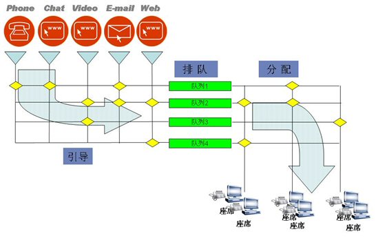 對于多種媒體采用統(tǒng)一的ACD處理方式,經(jīng)過引導(dǎo),進(jìn)入不同的隊列,分配到不同的坐席組。