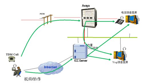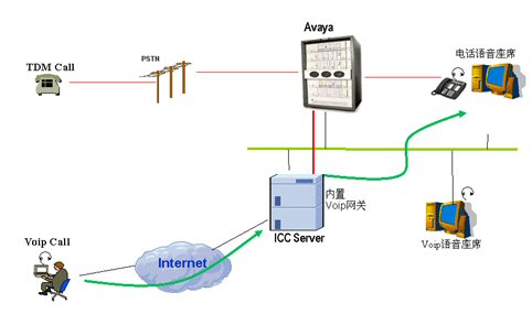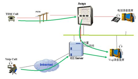 通過Internet來的Voip呼叫通過ICC服務(wù)器轉(zhuǎn)接到座席。