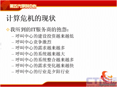 我們聽到IT服務商的抱怨可就更多了,說呼叫中心建設投資越來越低了,我在十年前建設一個20個座席的呼叫中心,能掙1500萬;可是現(xiàn)在20個座席的呼叫中心,10萬塊錢就把我打發(fā)了。呼叫中心競爭越來越激烈,投一個標,雖然一個呼叫中心只有100萬,這時候來的廠家有50家,相互壓價,相互壓價,這時候利潤都沒有了,F(xiàn)在的需求是越來越多了,體現(xiàn)在各個環(huán)節(jié),運營管理和業(yè)務模式上需求越來越多,最終客戶的要求也是越來越多,系統(tǒng)越來越大了,服務器也一大堆,以前一兩個服務器就夠了,現(xiàn)在需要4、5個,7、8個,這些服務器還需要相互進行聯(lián)絡整合,系統(tǒng)的整合越來越多,比如要和ERP整合,要和CRM整合,要和供應鏈整合,系統(tǒng)的整合越來越多,而且需求變化越來越大,呼叫中心需求的變化產(chǎn)生于很多方面,后面我會仔細介紹。呼叫中心的行業(yè)變成一個夕陽行業(yè)了,這是現(xiàn)在做IT服務商普遍在提的想法。