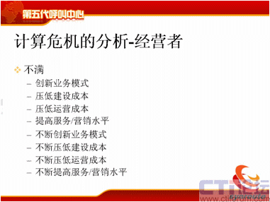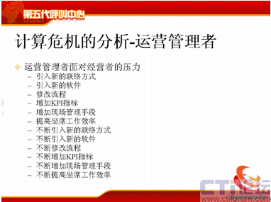 計算危機的下一方面是運營管理者,可能在座很多人是做運營管理的,你們會不斷去跟IT服務者提需求,我下一個月想引進新的聯(lián)絡方式,下個月我想引進新的軟件,引進新的流程,我想增加KPI指標,我想增加現(xiàn)場的管理手段,我想提高座席的工作效率,后面也是不斷的,不斷地去引入新的聯(lián)絡方式。