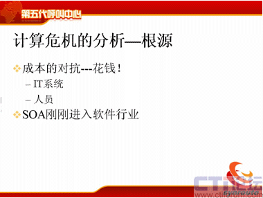 我們分析這個根源,根源其實就是錢的問題,昨天我聽了遠傳的Bill的講座,講得非常精彩,而且非常幽默,他在整個講的過程中,不斷地提一個次,提了30多次,說是“很花錢”呀,“太花錢”了,“很花錢”。確實是很花錢,呼叫中心是一個燒錢的中心,這是他的理論,其實我的想法也是一樣的。那么對于IT系統(tǒng)來說,確實需要花很多錢,現(xiàn)在的系統(tǒng)大家想想系統(tǒng)要么和CRM對接,要么和ERP對接,有的和供應鏈對接,有的和人力資源管理對接,有的和業(yè)務核心系統(tǒng)對接。那么人員上也是很花錢的,對于外包呼叫中心來說,客戶服務200座席左右的,人工的成本占到了75%,這個成本是非常高的,確實是很花錢。那么剛才也說了,剛才那些需求,短信的需求,大家看雖然很復雜,如果給我一千萬的話,我能輕松地把它搞定,給我一年的時間,但這是不現(xiàn)實的。解決的辦法有嗎?有,SOA。SOA是現(xiàn)在軟件行業(yè)一直在做的一件事情,是公認的標準,但是它剛剛進入中國,而且還都沒有進入呼叫中心。