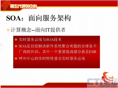 SOA就是面向服務的架構,這個概念近兩、三年來在中國的發(fā)展是比較快的,計算的概念,它是面向IT提供者。實時服務總線技術與SOA,SOA是目前解決軟件系統(tǒng)聚合難題的全球各個廠商的共識,其中一個重要的概念是ESB,不知道大家清楚嗎?就是企業(yè)服務總線,是SOA里面重要的組成部分,呼叫中心的實時特性要求,這個服務總線不是普通的服務總線,而是實時的服務總線。