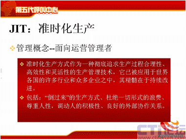 這四個特性是相輔相成的,首先在獨立方面,每一部分都有自己的特點,適應自己企業(yè)發(fā)展的需要,同時也是相互制約的。首先我說這個獨立意識,對于呼叫中心來說,從經(jīng)營者的角度上,為什么要提TSP的概念呢?我們經(jīng)常遇到一個企業(yè)建立呼叫中心,是一個客戶服務中心,我們現(xiàn)在要做電話營銷了,那好吧,我們就建一套電話營銷系統(tǒng);這時候我們要做網(wǎng)絡方面的營銷,好了,我們再做一個網(wǎng)絡營銷的呼叫中心,這是經(jīng)營者現(xiàn)在意識亟待需要提高的。對于運營管理者來說,JIT思想,我剛才說過它是一個核心的,它是一個不斷需要改進流程的,改進去優(yōu)化的,提出各種KPI指標去優(yōu)化的,那么這個過程也是現(xiàn)在目前運營管理者一直比較薄弱的,需要一直提高的部分。