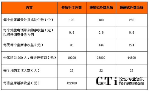 從上表可以看出,在同等每天3萬個(gè)呼叫任務(wù)的情況下,由于使用預(yù)測式外撥系統(tǒng)使得效率提升,所需人員數(shù)比預(yù)覽式外撥方式少用60人,比傳統(tǒng)手工外撥人員數(shù)量減少一半多,省的費(fèi)用也相當(dāng)可觀。