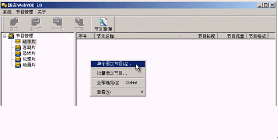 如果你要添加大量的節(jié)目,就需要用到"批量添加節(jié)目"這個(gè)功能了。批量添加又分為按目錄、按文件和添加連續(xù)劇3種。按目錄方式就是把一個(gè)文件夾里的所有流媒體文件全部加進(jìn)去;按文件方式就是手動(dòng)選擇多個(gè)文件添加;添加連續(xù)劇和按文件差不多,不同的是添加的多個(gè)文件共用一個(gè)連續(xù)劇名稱在網(wǎng)頁(yè)里出現(xiàn),你要點(diǎn)了連續(xù)劇的名稱進(jìn)入后再點(diǎn)想看的集數(shù)來(lái)觀看。